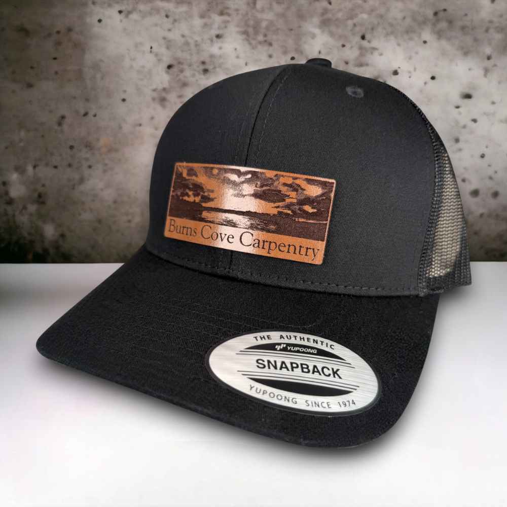 Custom Leather Patch Hats made for BURNS COVE CARPENTRY.