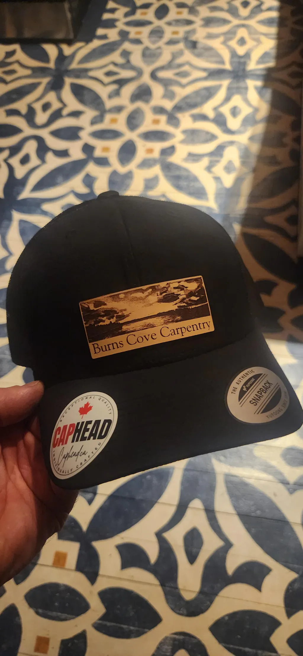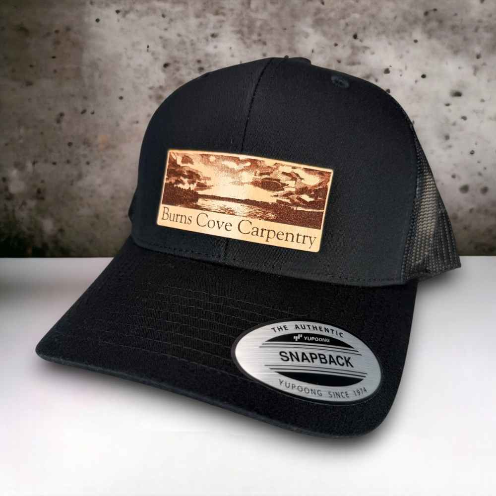 Custom Leather Patch Hats made for BURNS COVE CARPENTRY.