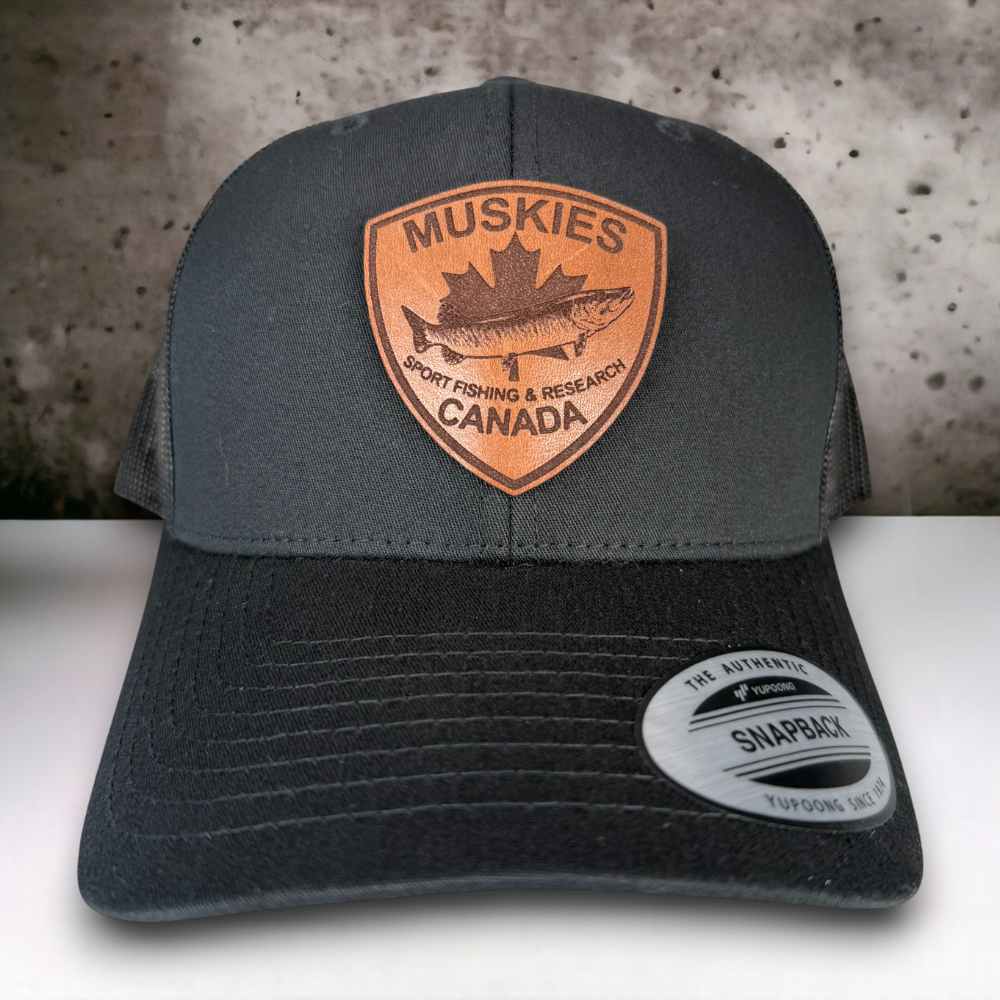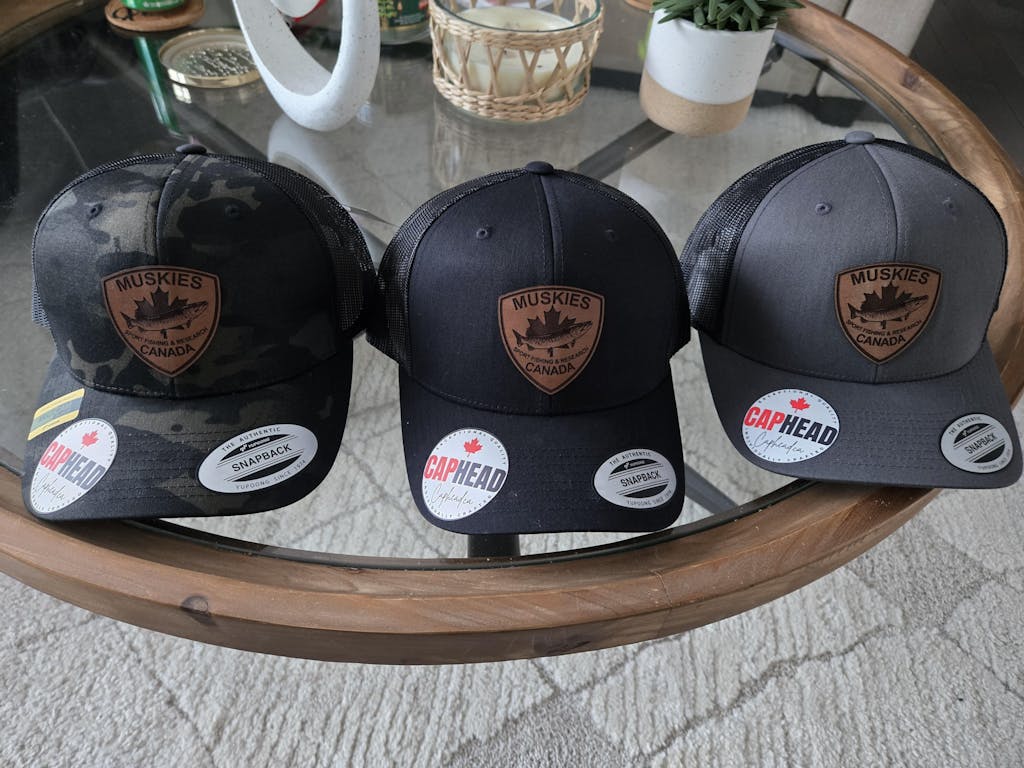 Custom Leather Patch Hats made for MUSKIES CANADA.